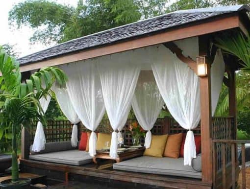A voile függöny lágyan omló textília, mutatós, sokrétűen használható a kültérben, kerti függöny, terasz függöny, pergola függönyként.