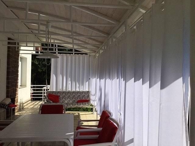 Vízlepergető tulajdonságú -Nem szabad azonban összekeverni a teflonbevonatú anyagokkal! Az anyag eső után kissé vizes lesz, de kiszáradás után nem károsodik. Jobban szűri a fényt, mint a kültéri nylon, sűrűbb szövésű, és matt és selymes fényű – a dekorok között viszonylag vékonyabb.